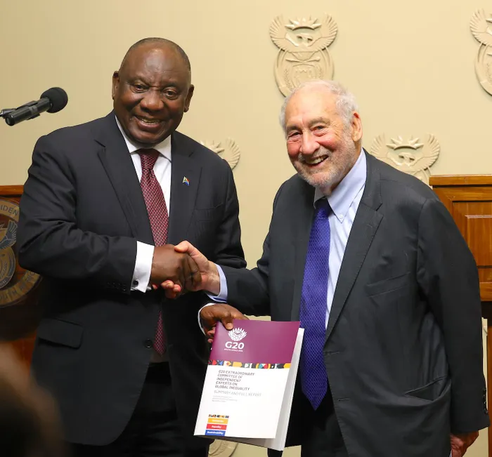 President Cyril Ramaphosa receives the G20 Task Team Report on Inequality from Professor Joseph Stiglitz during an official handover ceremony at Tuynhuys in Cape Town on November 4.