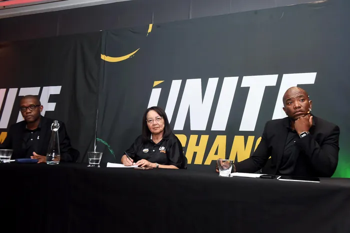 (FROM left) Rise Mzansi Leader Songezo Zibi, GOOD Party leader Patricia de Lille and leader of Build One South Africa (BOSA) Dr Mmusi Maimane, announced their new political party Unite for Change in Rosebank on October 05.
