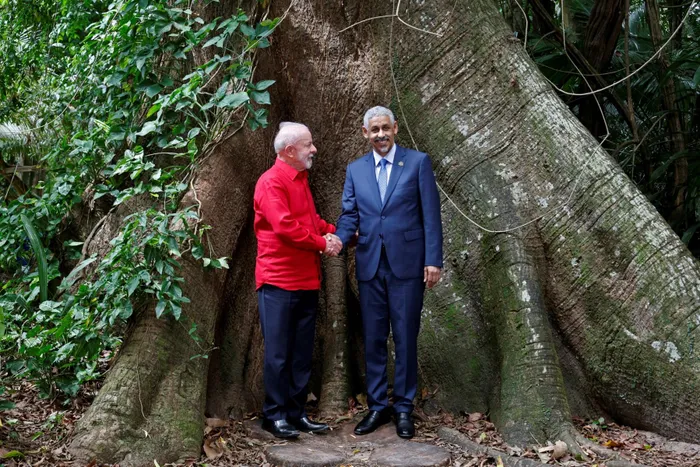 Brazil's President Luiz Inacio Lula da Silva and the President of the African Development Bank (AFDB) Sidi Ould Tah exchange greetings in Belem, Para State, Brazil on November 5, 2025. Brazil is hosting the COP30 UN climate summit currently underway in Belem.
