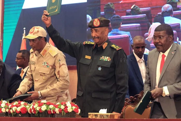Rapid Support Forces commander Mohamed Hamdan Daglo (left and )Sudan's Army chief Abdel Fattah al-Burhan (centre) wave documents alongside civilian leaders following the signing of an initial deal aimed at ending a deep crisis caused by a military coup, in the capital Khartoum on December 5, 2022.
