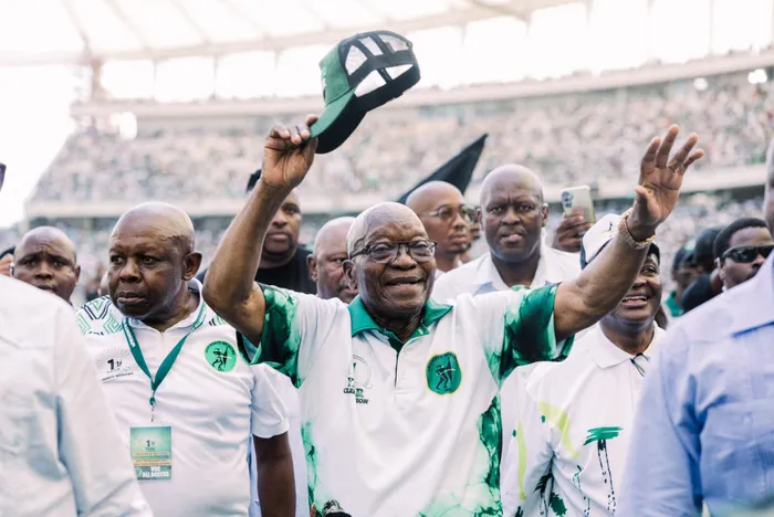 Leader of the Umkhonto We Sizwe (MKP) party and former South African president Jacob Zuma waves to supporters during the party's first anniversary celebrations at the Moses Mabhida stadium in Durban on December 15, 2024.