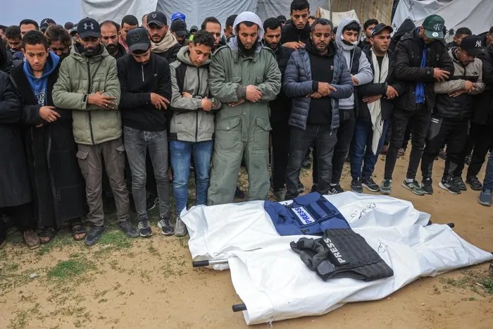 Family members and colleagues offer funeral prayers next to the bodies of the Palestinian journalists killed in an Israeli strike, in Khan Yunis, in the southern Gaza Strip on January 22, 2026. The Palestinian people, having suffered immensely from death and destruction and the denial of the right to self-determination, now find their immediate administrative future subject to the whims of an opaque, financially driven Board of Peace, says the writer.