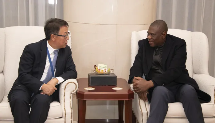 Deputy President Paul Mashatile (right) and Wu Peng, then Director General of African Affairs at China's Ministry of Foreign Affairs, in discussion ahead of the South Africa, China Bi-National Commission in Beijing on November 2, 2023. Mashatile co-chairs the BNC with Han Zheng Vice President of the People's Republic of China.
